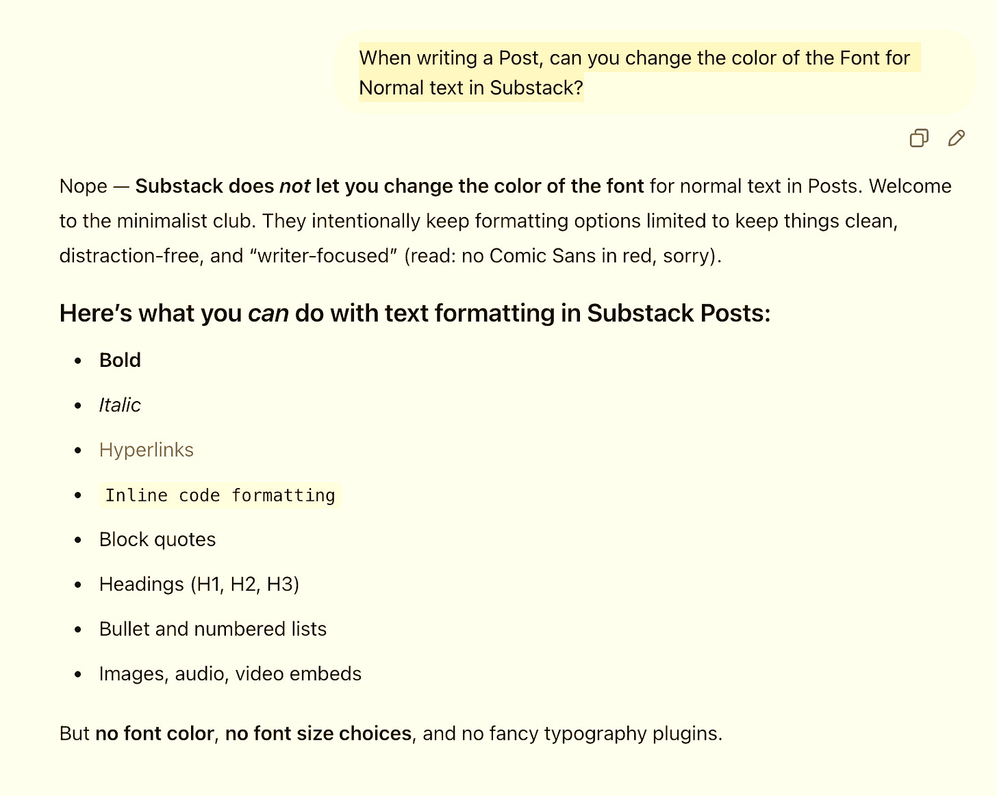Of course, you can also do bold, italic, links, and all that good stuff. Ok, wow, my Rules with this keep changing. So that last line was theirs, but I kept it. I actually used bold and italics in my quote, and in this line! I think when I become a Pro at Substack, I will look back at this First Post and either laugh my ass off, or be very proud of it! Or both!